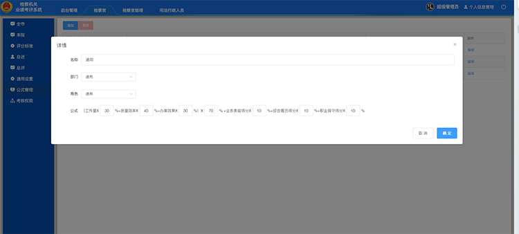 系統(tǒng)需具有靈活的考評模型設定功能,可針對不同的考核對象設定不同的考核模型。模型設定時可對檢察官業(yè)績考評內(nèi)容(業(yè)務工作、業(yè)務素能、綜合履職、職業(yè)操守)占比進行設定等。