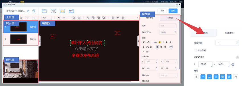 屬性區(qū):設(shè)置展示素材的屬性,文字,圖片,以及頁面屬性等;設(shè)置內(nèi)容的播放方式,如輪播、定時播放、互動播放等,并可以控制播放的進(jìn)度和暫停/繼續(xù)。